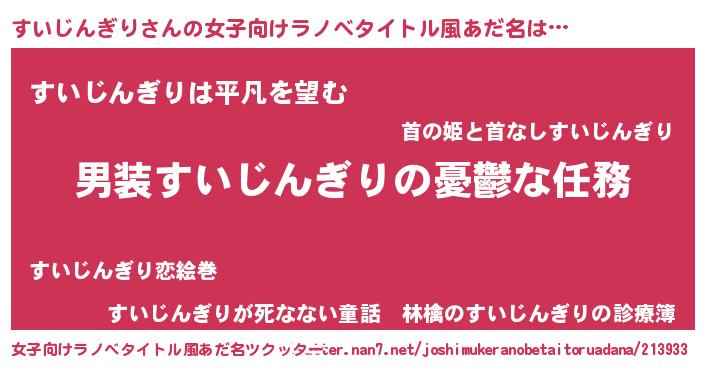 すいじんぎりさんの女子向けラノベタイトル風あだ名は… 『男装すいじんぎりの憂鬱な任務』『すいじんぎりは平凡を望む』『すいじんぎりが死なない童話 林檎のすいじんぎりの診療簿』 ツクッター #女子向けラノベタイトル風あだ名ツクッター http://tkutter.nan7.net/joshimukeranobetaitoruadana/213933/