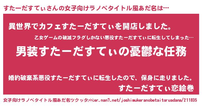 | 男性向けラノベタイトル風あだ名 | 『うちのすたーだすてぃが世界を掌握している!』 |