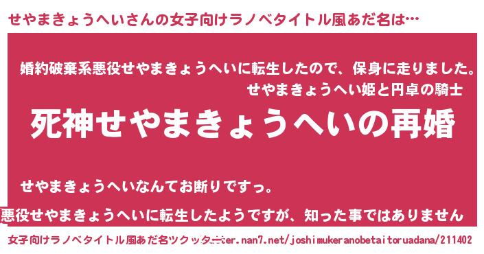 | 男性向けラノベタイトル風あだ名 | 『ノーゲーム・ノーセヤマキョウヘイ』 |