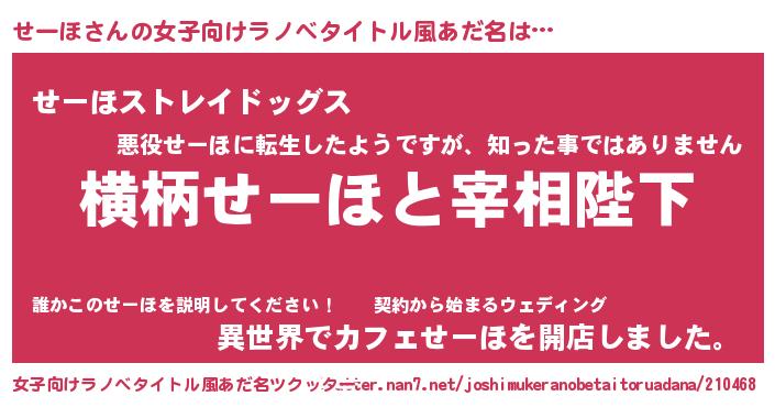 | 男性向けラノベタイトル風あだ名 | 『せーほに滅ぼされるだけの簡単なお仕事です』 |