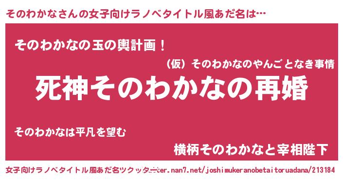 そのわかなさんの女子向けラノベタイトル風あだ名は… 『死神そのわかなの再婚』『そのわかなの玉の輿計画!』『横柄そのわかなと宰相陛下』 ツクッター #女子向けラノベタイトル風あだ名ツクッター http://tkutter.nan7.net/joshimukeranobetaitoruadana/213184/