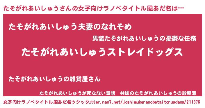 | 男性向けラノベタイトル風あだ名 | 『Re:たそがれあいしゅうから始める異世界生活』 |