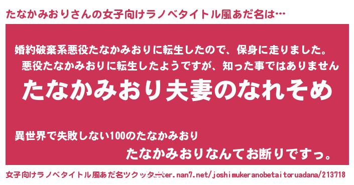 | 男性向けラノベタイトル風あだ名 | 『おまえをオタクにしてやるから、俺をたなかみおりにしてくれ! 』 |