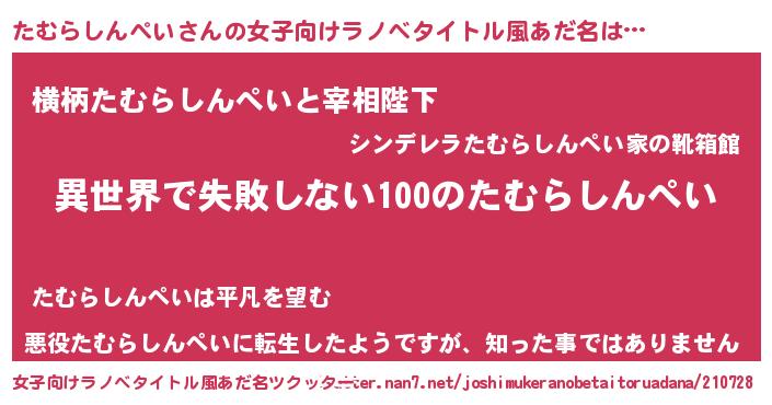 | 胡散臭い通販商品みたいなあだ名 | 『絶対に幸福をもたらす健康食品…その名も「たむらしんぺい」』 |