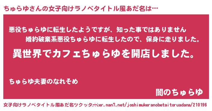 | 男性向けラノベタイトル風あだ名 | 『誰もが恐れるあのちゅらゆが、ぼくの専属メイドになるようです。』 |