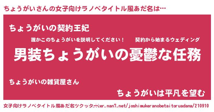 | 男性向けラノベタイトル風あだ名 | 『うちのちょうがいが世界を掌握している!』 |