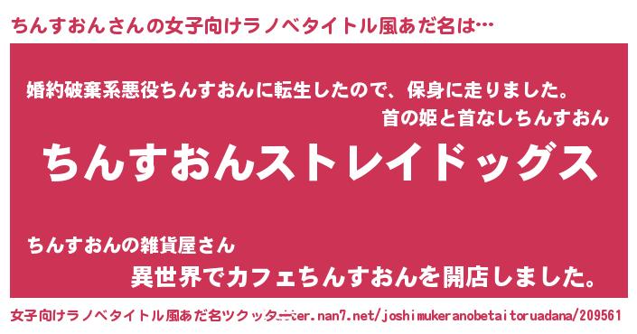 | 男性向けラノベタイトル風あだ名 | 『Re:ちんすおんから始める異世界生活』 |