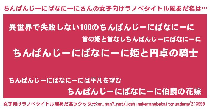 | 男性向けラノベタイトル風あだ名 | 『ちんぱんじーにばなにーにの憂鬱』 |