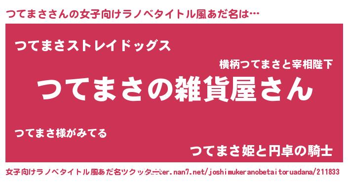 つてまささんの女子向けラノベタイトル風あだ名は… 『つてまさの雑貨屋さん』『つてまさストレイドッグス』『つてまさ姫と円卓の騎士』 ツクッター #女子向けラノベタイトル風あだ名ツクッター http://tkutter.nan7.net/joshimukeranobetaitoruadana/211833/