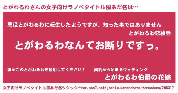 | 胡散臭い通販商品みたいなあだ名 | 『ガンによく効く高麗人参…その名も「とがわるわ」』 |