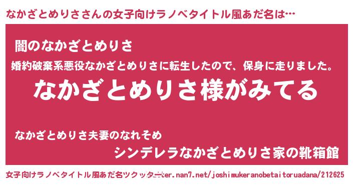 なかざとめりささんの女子向けラノベタイトル風あだ名は… 『なかざとめりさ様がみてる』『闇のなかざとめりさ』『シンデレラなかざとめりさ家の靴箱館』 ツクッター #女子向けラノベタイトル風あだ名ツクッター http://tkutter.nan7.net/joshimukeranobetaitoruadana/212625/