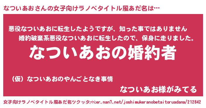 | 男性向けラノベタイトル風あだ名 | 『うちの娘の為ならば、俺はもしかしたらなついあおも倒せるかもしれない。』 |