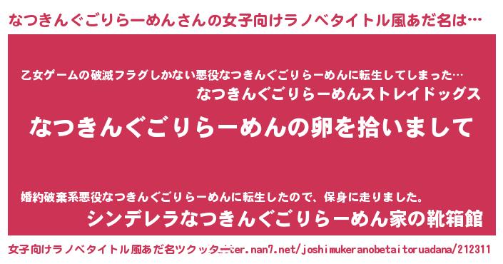 | 萌えアニメ | 主人公(なつきんぐごりらーめん)のあだ名『 なつちん』 |