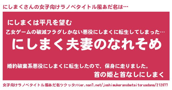 | 男性向けラノベタイトル風あだ名 | 『おまえをオタクにしてやるから、俺をにしまくにしてくれ! 』 |