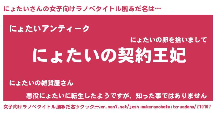 | 胡散臭い通販商品みたいなあだ名 | 『来世でも幸せになれる健康食品…その名も「にょたい」』 |