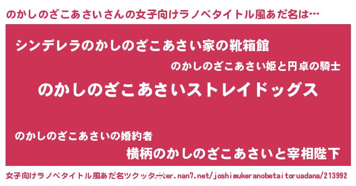 | 男性向けラノベタイトル風あだ名 | 『Re:のかしのざこあさいから始める異世界生活』 |