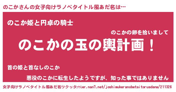 | 男性向けラノベタイトル風あだ名 | 『のこか~年齢イコール彼女いない歴の魔法使い~』 |