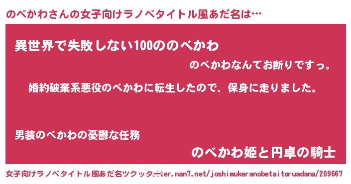 | 男性向けラノベタイトル風あだ名 | 『転生したらのべかわだった件』 |