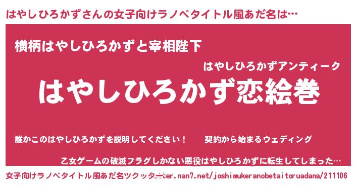| 男性向けラノベタイトル風あだ名 | 『ノーゲーム・ノーハヤシヒロカズ』 |