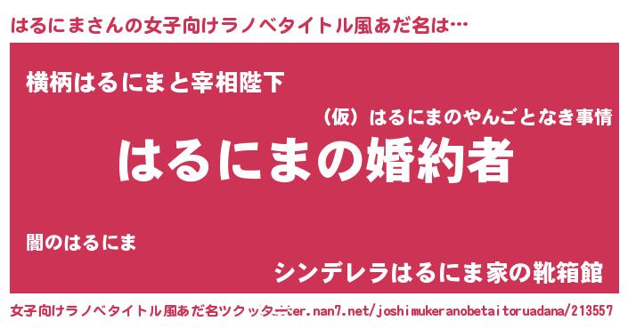 | 男性向けラノベタイトル風あだ名 | 『うちの娘の為ならば、俺はもしかしたらはるにまも倒せるかもしれない。』 |