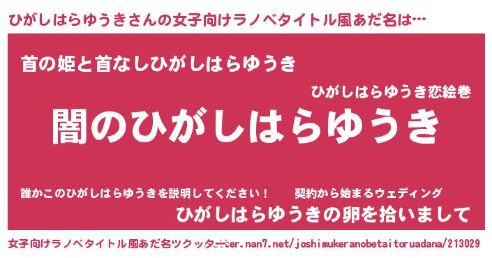 | 男性向けラノベタイトル風あだ名 | 『Re:ひがしはらゆうきから始める異世界生活』 |