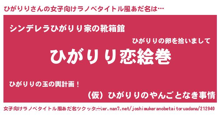 | 男性向けラノベタイトル風あだ名 | 『おまえをオタクにしてやるから、俺をひがりりにしてくれ! 』 |