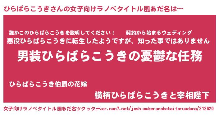 | 男性向けラノベタイトル風あだ名 | 『うちのひらばらこうきが世界を掌握している!』 |