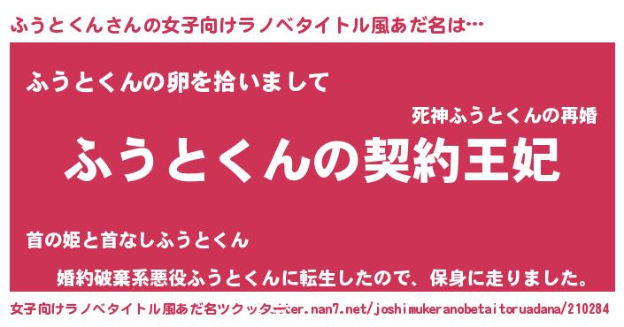 | 男性向けラノベタイトル風あだ名 | 『ふうとくんという概念が存在しない退屈な世界 』 |