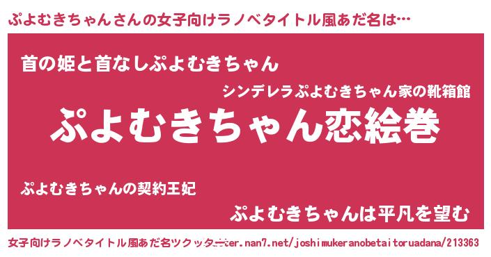 | 男性向けラノベタイトル風あだ名 | 『おまえをオタクにしてやるから、俺をぷよむきちゃんにしてくれ! 』 |
