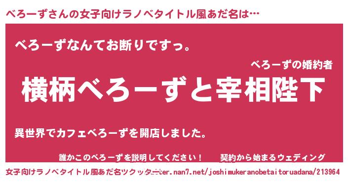 | 男性向けラノベタイトル風あだ名 | 『べろーずに滅ぼされるだけの簡単なお仕事です』 |