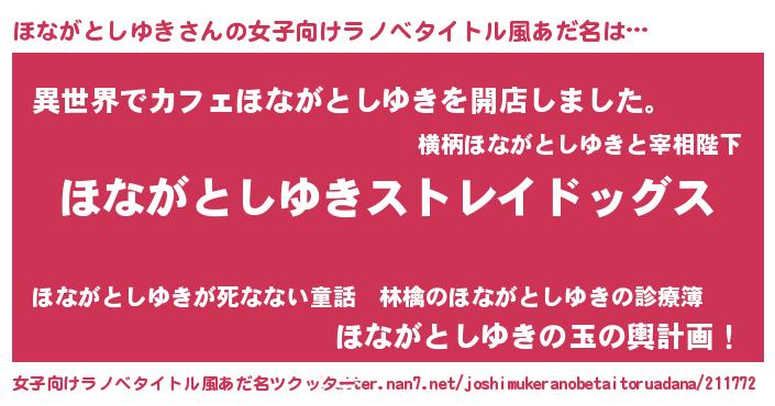 | 男性向けラノベタイトル風あだ名 | 『Re:ほながとしゆきから始める異世界生活』 |