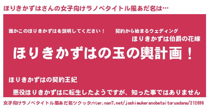 ほりきかずはさんの女子向けラノベタイトル風あだ名は… 『ほりきかずはの玉の輿計画!』『誰かこのほりきかずはを説明してください! ~契約から始まるウェディング~』『悪役ほりきかずはに転生したようですが、知った事ではありません』 ツクッター #女子向けラノベタイトル風あだ名ツクッター http://tkutter.nan7.net/joshimukeranobetaitoruadana/212696/