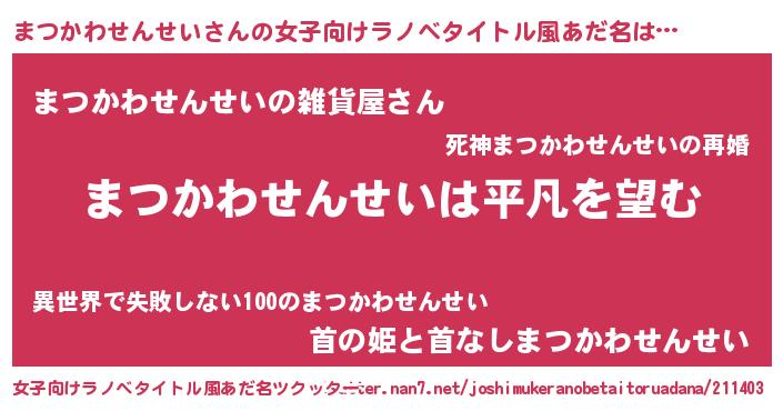 | 男性向けラノベタイトル風あだ名 | 『ダンジョンにまつかわせんせいを求めるのは間違っているだろうか』 |
