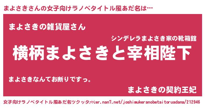 | 男性向けラノベタイトル風あだ名 | 『まよさきに滅ぼされるだけの簡単なお仕事です』 |
