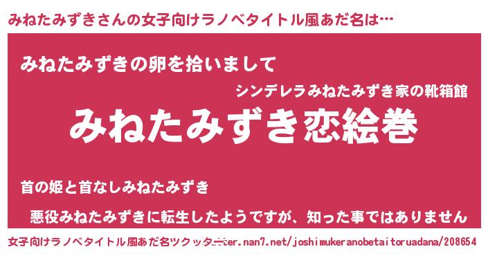 | 男性向けラノベタイトル風あだ名 | 『おまえをオタクにしてやるから、俺をみねたみずきにしてくれ! 』 |