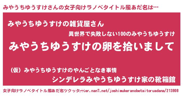 | 男性向けラノベタイトル風あだ名 | 『ダンジョンにみやうちゆうすけを求めるのは間違っているだろうか』 |