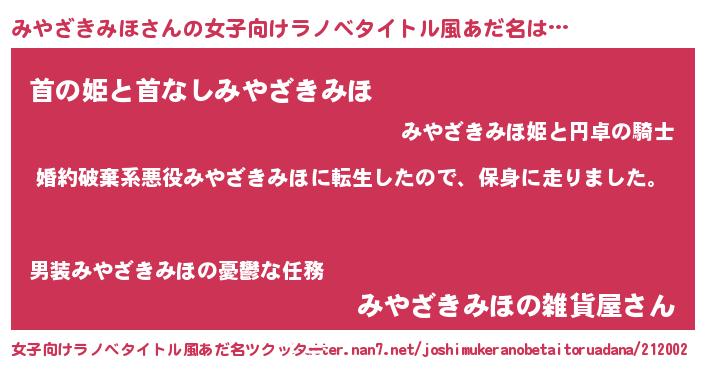 | 肩書あだ名 | 『みやざきみほ大将』『みやざきみほ店長』 |