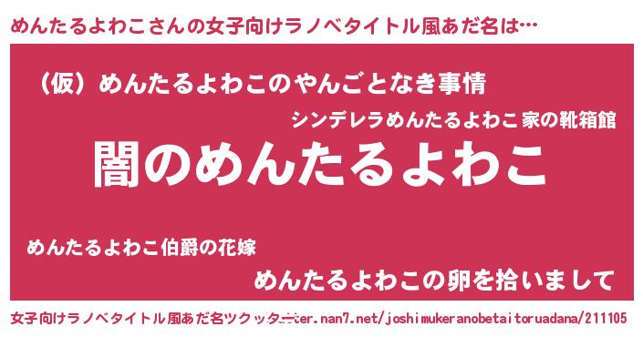 | 男性向けラノベタイトル風あだ名 | 『Re:めんたるよわこから始める異世界生活』 |