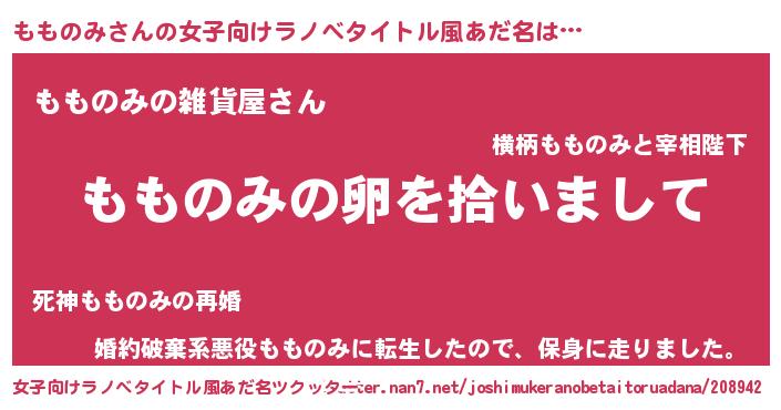 もものみさんの女子向けラノベタイトル風あだ名は… 『もものみの卵を拾いまして』『もものみの雑貨屋さん』『婚約破棄系悪役もものみに転生したので、保身に走りました。』 ツクッター #女子向けラノベタイトル風あだ名ツクッター http://tkutter.nan7.net/joshimukeranobetaitoruadana/208942/