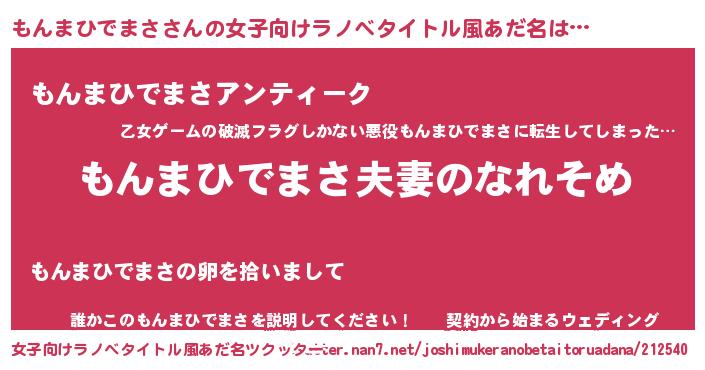 | 男性向けラノベタイトル風あだ名 | 『おまえをオタクにしてやるから、俺をもんまひでまさにしてくれ! 』 |