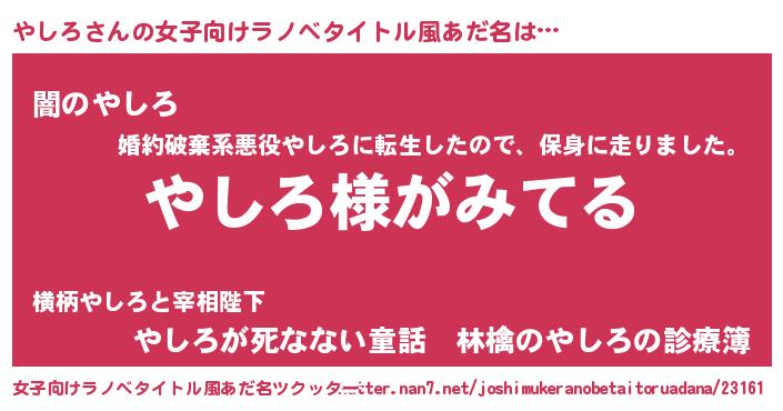 | 意味不明あだ名 | 『とにかく怪しいやしろ』『自称やしろ』 |
