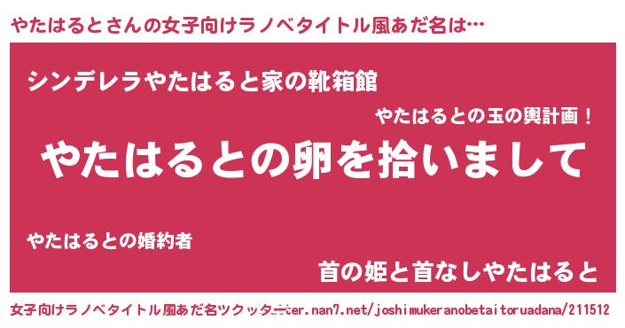 | 男性向けラノベタイトル風あだ名 | 『やたはるとの嫁は女の子じゃないと思った?』 |