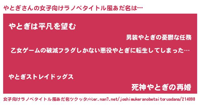 | 男性向けラノベタイトル風あだ名 | 『魔弾の王とやとぎ』 |