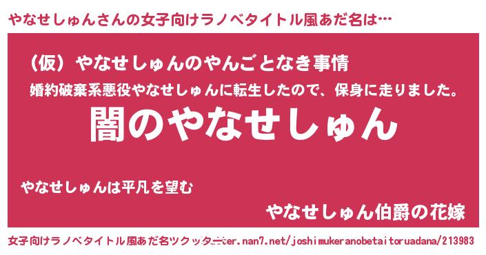 | 男性向けラノベタイトル風あだ名 | 『Re:やなせしゅんから始める異世界生活』 |