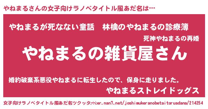 やねまるさんの女子向けラノベタイトル風あだ名は… 『やねまるの雑貨屋さん』『やねまるが死なない童話 林檎のやねまるの診療簿』『やねまるストレイドッグス』 ツクッター #女子向けラノベタイトル風あだ名ツクッター http://tkutter.nan7.net/joshimukeranobetaitoruadana/214254/