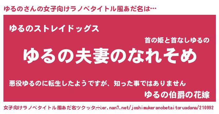 | 男性向けラノベタイトル風あだ名 | 『おまえをオタクにしてやるから、俺をゆるのにしてくれ! 』 |