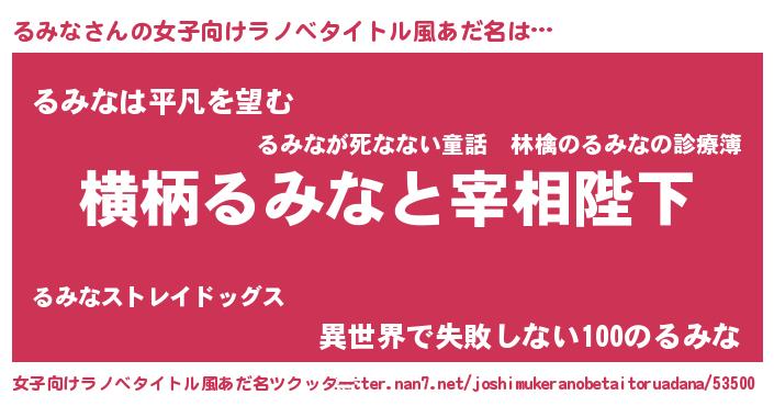 | 男性向けラノベタイトル風あだ名 | 『るみなに滅ぼされるだけの簡単なお仕事です』 |