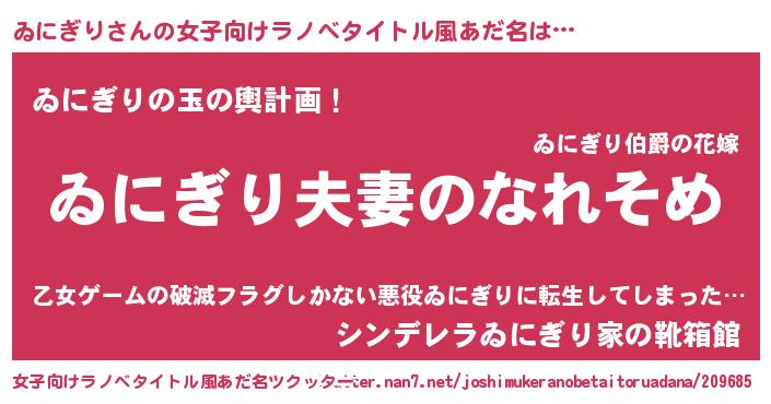 | 男性向けラノベタイトル風あだ名 | 『おまえをオタクにしてやるから、俺をゐにぎりにしてくれ! 』 |