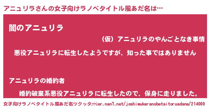 | 男性向けラノベタイトル風あだ名 | 『この素晴らしい世界にアニュリラを!』 |