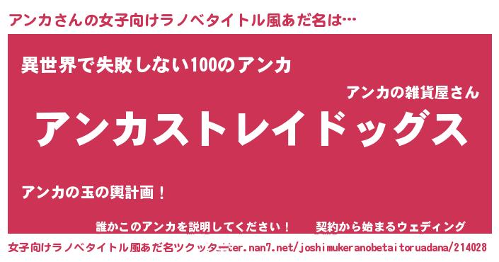 | 男性向けラノベタイトル風あだ名 | 『Re:アンカから始める異世界生活』 |